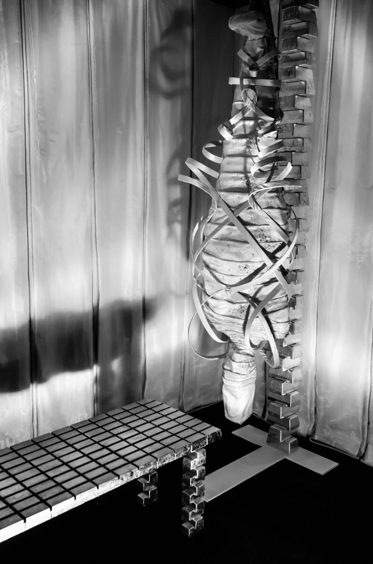 Inspired by 17th-century naturalist, botanical artist, and renowned entomologist Maria Sibylla Merian, Cocoon (2014)explores the beauty in metamorphosis. This work, crafted by intricately fashioning, tucking, beading, and styling fabric, aims to bring to light topics of transformation and coming of age. Cocoon asks viewers to find solace and beauty in the journey, rather than just the outcome or product — which, in this case, would be the emerged butterfly. Pirbahi utilizes gold-leaf blocks as a support system for the sculpture to represent the organic systems that support cocoons during their incubation. These luxurious materials call to mind the beauty and scarcity of our natural world. This work is a collaboration with fabricator Philip Brown and Camal Pirbhai and has been exhibited at IDS.